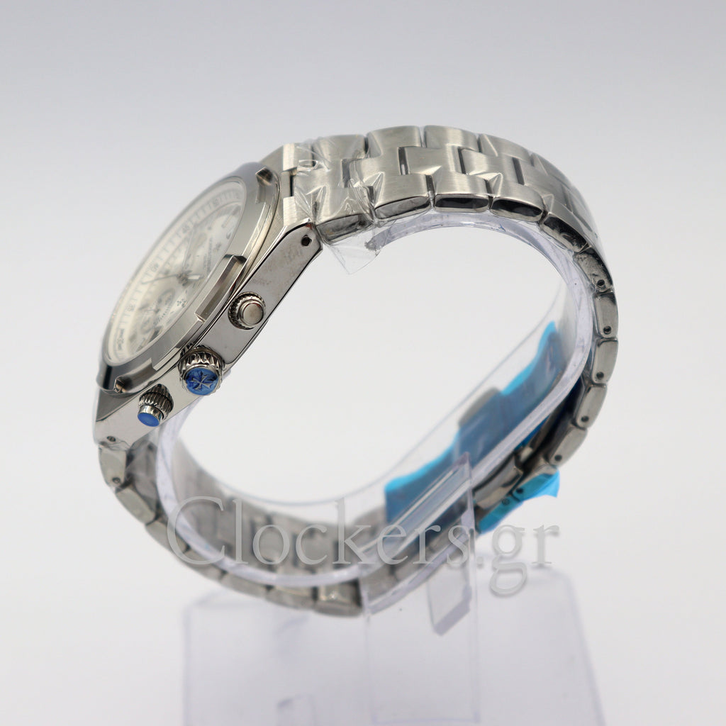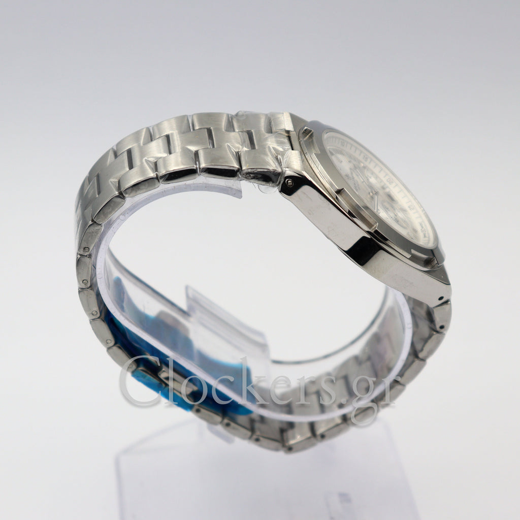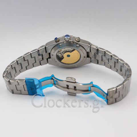 Είναι αδιάβροχο, στεγανοποιημένο έως 0 bar και έχει ρυθμιστική βίδα με ανάγλυφη κορόνα. Ο ζαφειρένιος κρυστάλλος είναι αρκετά ανθεκτικός σε γρατσουνιές