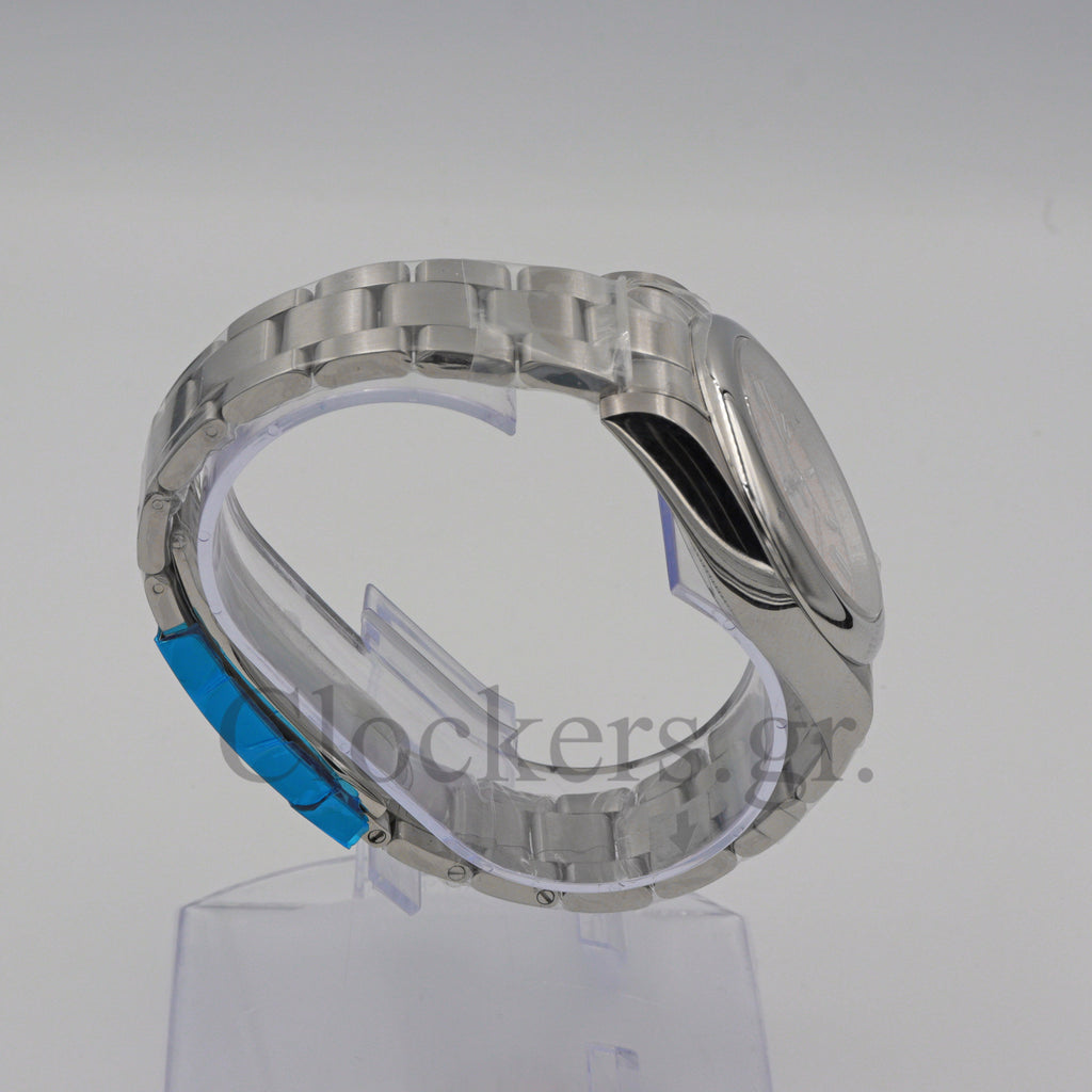 αδιάβροχο, στεγανοποιημένο έως 10 bar και έχει ρυθμιστική βίδα με ανάγλυφη κορόνα. Ο ζαφειρένιος κρυστάλλος είναι αρκετά ανθεκτικός σε γρατσουνιές και έχει μεγέθυνση (επιπέδου 2.5x) πάνω από την ημερομηνία.