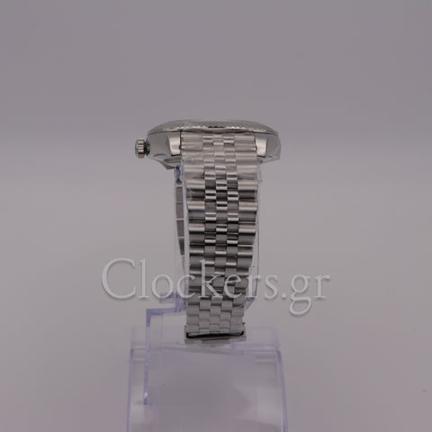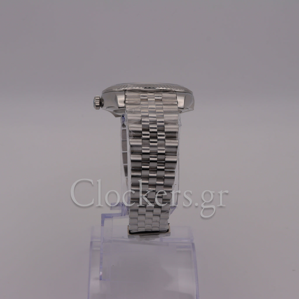 αδιάβροχο, στεγανοποιημένο έως 10 bar και έχει ρυθμιστική βίδα με ανάγλυφη κορόνα. Ο ζαφειρένιος κρυστάλλος είναι αρκετά ανθεκτικός σε γρατσουνιές και έχει μεγέθυνση (επιπέδου 2.5x) πάνω από την ημερομηνία.