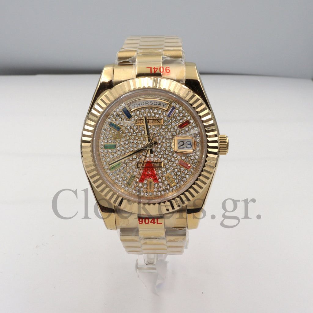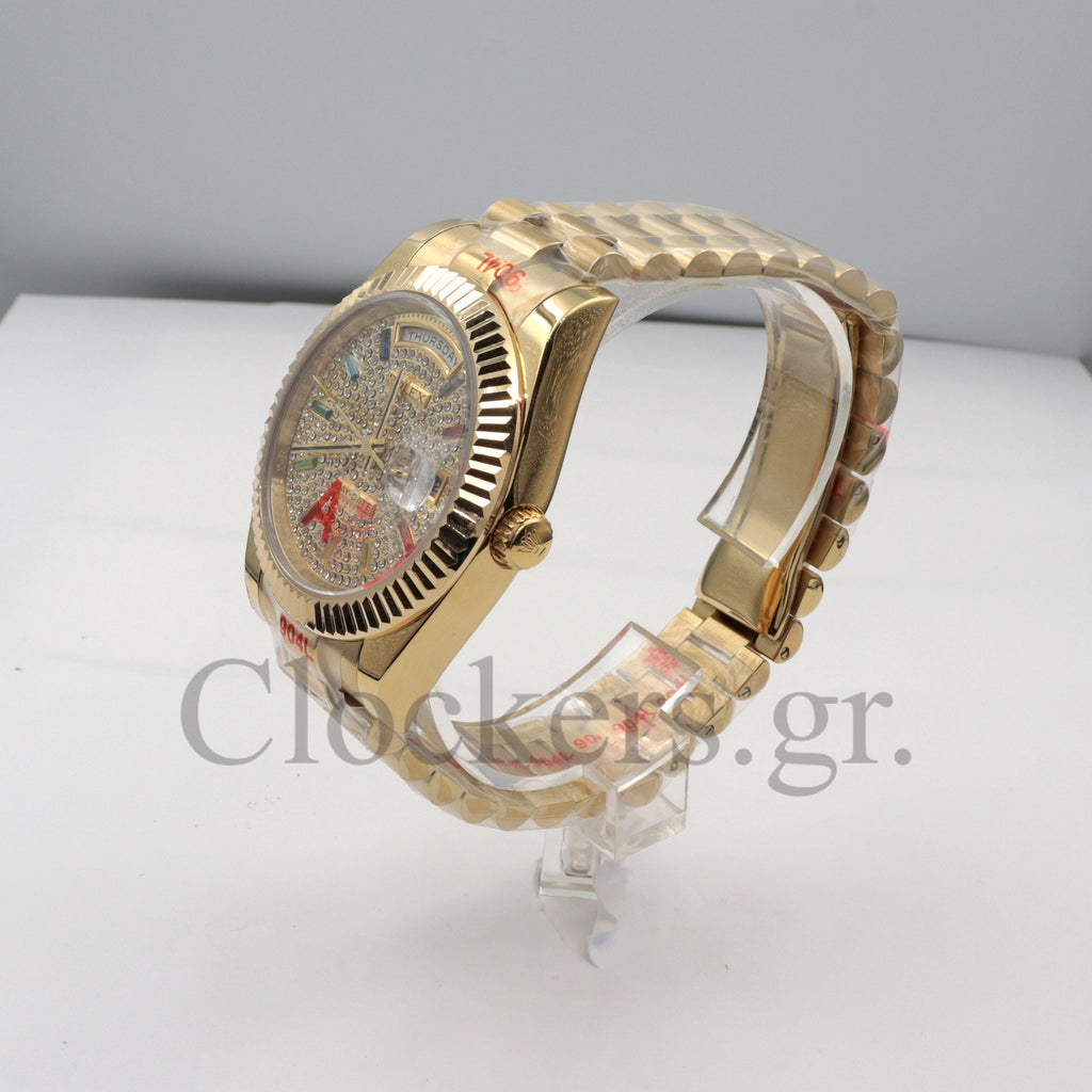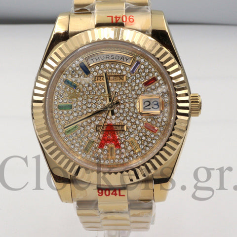 Gold Day Date 40mm Watch Fluted Bezel Diamond Paved Rainbow Sapphire Dial